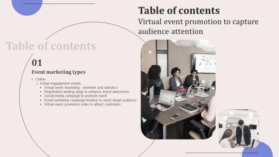 Present like a pro with Virtual Event Promotion To Capture Audience Attention Table Of Contents Pictures Pdf Create beautiful presentations together with your team, using our easy-to-use presentation slides. Share your ideas in real-time and make changes on the fly by downloading our templates. So whether you are in the office, on the go, or in a remote location, you can stay in sync with your team and present your ideas with confidence. With Slidegeeks presentation got a whole lot easier. Grab these presentations today. Our Virtual Event Promotion To Capture Audience Attention Table Of Contents Pictures Pdf are topically designed to provide an attractive backdrop to any subject. Use them to look like a presentation pro.
