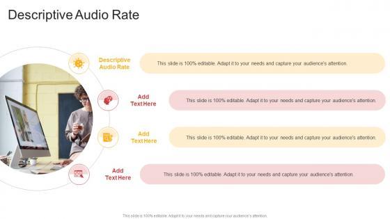 Introducing our well-designed Descriptive Audio Rate In Powerpoint And Google Slides Cpb. This PowerPoint design presents information on topics like Descriptive Audio Rate. As it is predesigned it helps boost your confidence level. It also makes you a better presenter because of its high-quality content and graphics. This PPT layout can be downloaded and used in different formats like PDF, PNG, and JPG. Not only this, it is available in both Standard Screen and Widescreen aspect ratios for your convenience. Therefore, click on the download button now to persuade and impress your audience. Our Descriptive Audio Rate In Powerpoint And Google Slides Cpb are topically designed to provide an attractive backdrop to any subject. Use them to look like a presentation pro.