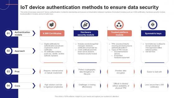 This slide showcases several IoT device authentication models for standardise and secure communication between machines. It included modules such as X.509 certificates, hardware security module, trusted platform module, and symmetric keys. Slidegeeks has constructed IoT Device Management Fundamentals IoT Device Authentication Methods To Ensure Data Security IoT SS V after conducting extensive research and examination. These presentation templates are constantly being generated and modified based on user preferences and critiques from editors. Here, you will find the most attractive templates for a range of purposes while taking into account ratings and remarks from users regarding the content. This is an excellent jumping-off point to explore our content and will give new users an insight into our top-notch PowerPoint Templates. This slide showcases several IoT device authentication models for standardise and secure communication between machines. It included modules such as X.509 certificates, hardware security module, trusted platform module, and symmetric keys.