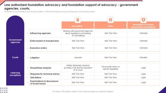 This template covers permissible for public private foundation, on different advocacies such as government agencies, courts, lobbying exceptions.Deliver and pitch your topic in the best possible manner with this Law Authorized Foundation Advocacy And Foundation Support Of Advocacy Themes PDF. Use them to share invaluable insights on Influence Specific, Supporting Opposing, Impermissible and impress your audience. This template can be altered and modified as per your expectations. So, grab it now.