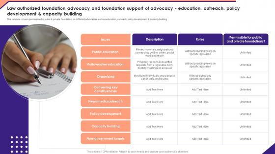 This template covers permissible for public private foundation, on different advocacies such as education, outreach, policy development capacity building.Deliver and pitch your topic in the best possible manner with this Community Policy Resources Law Authorized Foundation Advocacy And Foundation Support Of Advocacy Education Inspiration PDF. Use them to share invaluable insights on Policymaker Education, Capacity Building, Convening Constituencies and impress your audience. This template can be altered and modified as per your expectations. So, grab it now.