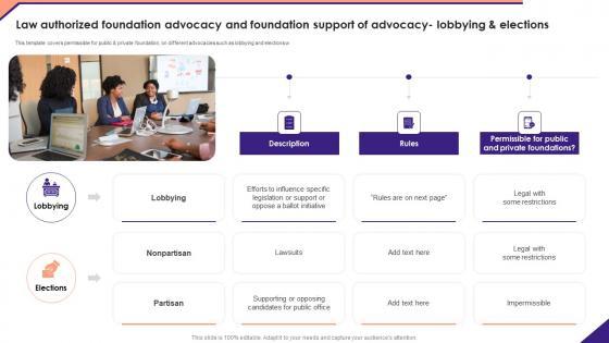 This template covers permissible for public and private foundation, on different advocacies such as education, outreach, policy development and capacity building Are you searching for a Law Authorized Foundation Advocacy Not For Profit Venture Playbook Ideas Pdf that is uncluttered, straightforward, and original Its easy to edit, and you can change the colors to suit your personal or business branding. For a presentation that expresses how much effort you have put in, this template is ideal With all of its features, including tables, diagrams, statistics, and lists, its perfect for a business plan presentation. Make your ideas more appealing with these professional slides. Download Law Authorized Foundation Advocacy Not For Profit Venture Playbook Ideas Pdf from Slidegeeks today. This template covers permissible for public and private foundation, on different advocacies such as education, outreach, policy development and capacity building