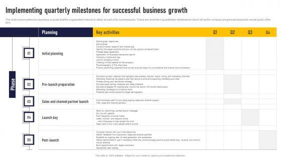 The slide covers particular objectives or goals that the organization intends to attain as part of its business plan. These are short-term quantifiable milestones to check off as the company progresses toward its overall goals of the firm. Get a simple yet stunning designed Implementing Quarterly Milestones For Successful Auto Dealership Business Plan Information Pdf It is the best one to establish the tone in your meetings. It is an excellent way to make your presentations highly effective. So, download this PPT today from Slidegeeks and see the positive impacts. Our easy-to-edit Implementing Quarterly Milestones For Successful Auto Dealership Business Plan Information Pdf can be your go-to option for all upcoming conferences and meetings. So, what are you waiting for Grab this template today. The slide covers particular objectives or goals that the organization intends to attain as part of its business plan. These are short-term quantifiable milestones to check off as the company progresses toward its overall goals of the firm.
