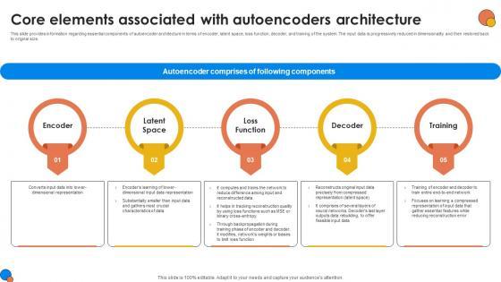 This slide provides information regarding essential components of autoencoder architecture in terms of encoder, latent space, loss function, decoder, and training of the system. The input data is progressively reduced in dimensionality and then restored back to original size. From laying roadmaps to briefing everything in detail, our templates are perfect for you. You can set the stage with your presentation slides. All you have to do is download these easy-to-edit and customizable templates. Core Elements Associated With Autoencoders Generative AI For Better Productivity AI SS V will help you deliver an outstanding performance that everyone would remember and praise you for. Do download this presentation today. This slide provides information regarding essential components of autoencoder architecture in terms of encoder, latent space, loss function, decoder, and training of the system. The input data is progressively reduced in dimensionality and then restored back to original size.