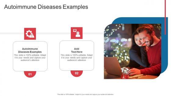 Introducing our well designed Autoimmune Diseases Examples In Powerpoint And Google Slides Cpb. This PowerPoint design presents information on topics like Autoimmune Diseases Examples. As it is predesigned it helps boost your confidence level. It also makes you a better presenter because of its high quality content and graphics. This PPT layout can be downloaded and used in different formats like PDF, PNG, and JPG. Not only this, it is available in both Standard Screen and Widescreen aspect ratios for your convenience. Therefore, click on the download button now to persuade and impress your audience. Our Autoimmune Diseases Examples In Powerpoint And Google Slides Cpb are topically designed to provide an attractive backdrop to any subject. Use them to look like a presentation pro.