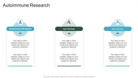 Introducing our well designed Autoimmune Research In Powerpoint And Google Slides Cpb. This PowerPoint design presents information on topics like Autoimmune Research. As it is predesigned it helps boost your confidence level. It also makes you a better presenter because of its high quality content and graphics. This PPT layout can be downloaded and used in different formats like PDF, PNG, and JPG. Not only this, it is available in both Standard Screen and Widescreen aspect ratios for your convenience. Therefore, click on the download button now to persuade and impress your audience. Our Autoimmune Research In Powerpoint And Google Slides Cpb are topically designed to provide an attractive backdrop to any subject. Use them to look like a presentation pro.