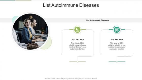 Introducing our well designed List Autoimmune Diseases In Powerpoint And Google Slides Cpb. This PowerPoint design presents information on topics like List Autoimmune Diseases. As it is predesigned it helps boost your confidence level. It also makes you a better presenter because of its high quality content and graphics. This PPT layout can be downloaded and used in different formats like PDF, PNG, and JPG. Not only this, it is available in both Standard Screen and Widescreen aspect ratios for your convenience. Therefore, click on the download button now to persuade and impress your audience. Our List Autoimmune Diseases In Powerpoint And Google Slides Cpb are topically designed to provide an attractive backdrop to any subject. Use them to look like a presentation pro.