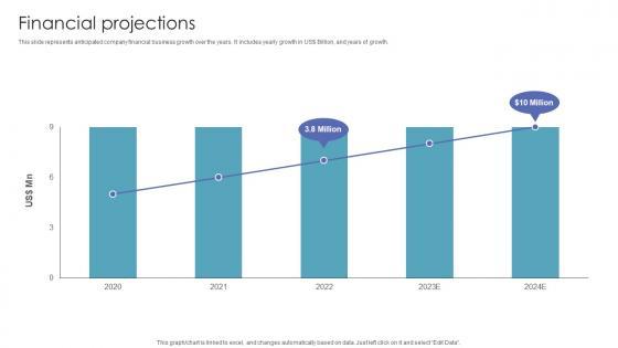 This slide represents anticipated company financial business growth over the years. It includes yearly growth in US dollar Billion, and years of growth.Slidegeeks is here to make your presentations a breeze with Financial Projections Investor Funding Pitch Deck For Automated Ar Platform With our easy-to-use and customizable templates, you can focus on delivering your ideas rather than worrying about formatting. With a variety of designs to choose from, you are sure to find one that suits your needs. And with animations and unique photos, illustrations, and fonts, you can make your presentation pop. So whether you are giving a sales pitch or presenting to the board, make sure to check out Slidegeeks first This slide represents anticipated company financial business growth over the years. It includes yearly growth in US dollar Billion, and years of growth.