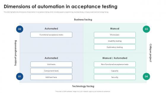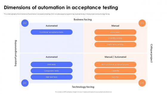 This slide highlights the dimensions of automation in acceptance testing which includes support programming, business facing, critique project and technology facing. If you are looking for a format to display your unique thoughts, then the professionally designed Dimensions Of Automation In Acceptance Testing PPT Sample is the one for you. You can use it as a Google Slides template or a PowerPoint template. Incorporate impressive visuals, symbols, images, and other charts. Modify or reorganize the text boxes as you desire. Experiment with shade schemes and font pairings. Alter, share or cooperate with other people on your work. Download Dimensions Of Automation In Acceptance Testing PPT Sample and find out how to give a successful presentation. Present a perfect display to your team and make your presentation unforgettable. This slide highlights the dimensions of automation in acceptance testing which includes support programming, business facing, critique project and technology facing.