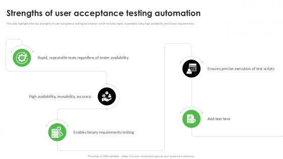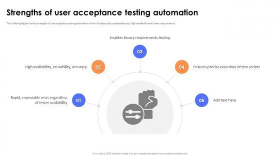 This slide highlights the key strengths of user acceptance testing automation which includes rapid, repeatable tests, high availability and binary requirements. Presenting this PowerPoint presentation, titled Strengths Of User Acceptance Testing Automation Acceptance Testing PPT Example, with topics curated by our researchers after extensive research. This editable presentation is available for immediate download and provides attractive features when used. Download now and captivate your audience. Presenting this Strengths Of User Acceptance Testing Automation Acceptance Testing PPT Example. Our researchers have carefully researched and created these slides with all aspects taken into consideration. This is a completely customizable Strengths Of User Acceptance Testing Automation Acceptance Testing PPT Example that is available for immediate downloading. Download now and make an impact on your audience. Highlight the attractive features available with our PPTs. This slide highlights the key strengths of user acceptance testing automation which includes rapid, repeatable tests, high availability and binary requirements.