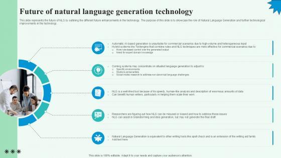 This slide represents the future of NLG by outlining the different future enhancements in the technology. The purpose of this slide is to showcase the role of Natural Language Generation and further technological improvements in the technology. Coming up with a presentation necessitates that the majority of the effort goes into the content and the message you intend to convey. The visuals of a PowerPoint presentation can only be effective if it supplements and supports the story that is being told. Keeping this in mind our experts created Future Of Natural Language Generation Automated Content Generation PPT Slide to reduce the time that goes into designing the presentation. This way, you can concentrate on the message while our designers take care of providing you with the right template for the situation. This slide represents the future of NLG by outlining the different future enhancements in the technology. The purpose of this slide is to showcase the role of Natural Language Generation and further technological improvements in the technology.