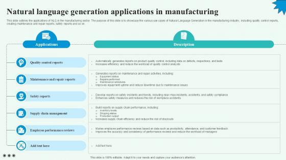This slide outlines the applications of NLG in the manufacturing sector. The purpose of this slide is to showcase the various use cases of Natural Language Generation in the manufacturing industry, including quality control reports, creating maintenance and repair reports, safety reports and so on. Take your projects to the next level with our ultimate collection of Natural Language Generation Automated Content Generation PPT Example. Slidegeeks has designed a range of layouts that are perfect for representing task or activity duration, keeping track of all your deadlines at a glance. Tailor these designs to your exact needs and give them a truly corporate look with your own brand colors they will make your projects stand out from the rest This slide outlines the applications of NLG in the manufacturing sector. The purpose of this slide is to showcase the various use cases of Natural Language Generation in the manufacturing industry, including quality control reports, creating maintenance and repair reports, safety reports and so on.