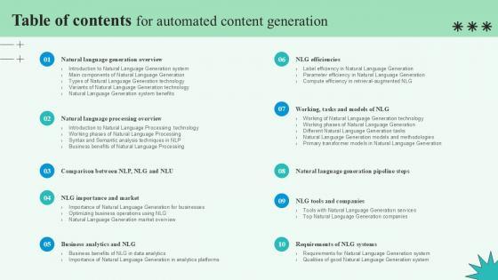 Are you in need of a template that can accommodate all of your creative concepts This one is crafted professionally and can be altered to fit any style. Use it with Google Slides or PowerPoint. Include striking photographs, symbols, depictions, and other visuals. Fill, move around, or remove text boxes as desired. Test out color palettes and font mixtures. Edit and save your work, or work with colleagues. Download Table Of Contents For Automated Content Generation PPT Example and observe how to make your presentation outstanding. Give an impeccable presentation to your group and make your presentation unforgettable. Our Table Of Contents For Automated Content Generation PPT Example are topically designed to provide an attractive backdrop to any subject. Use them to look like a presentation pro.