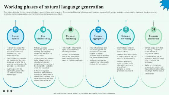 This slide outlines the Working phases of Natural Language Generation technology. The purpose of this slide is to showcase the various phases of NLG working, including content analysis, data understanding, document structuring, sentence aggregation, grammar structuring, and language presentation. The best PPT templates are a great way to save time, energy, and resources. Slidegeeks have 100 percent editable powerpoint slides making them incredibly versatile. With these quality presentation templates, you can create a captivating and memorable presentation by combining visually appealing slides and effectively communicating your message. Download Working Phases Of Natural Automated Content Generation PPT Sample from Slidegeeks and deliver a wonderful presentation. This slide outlines the Working phases of Natural Language Generation technology. The purpose of this slide is to showcase the various phases of NLG working, including content analysis, data understanding, document structuring, sentence aggregation, grammar structuring, and language presentation.
