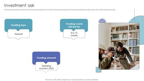 Following slide provides information about amount of funding asked by company for future business expansion. It includes funding type, funding amount, and months required for funding.Find highly impressive Investment Ask Investor Funding Pitch Deck For Automated Ar Platform on Slidegeeks to deliver a meaningful presentation. You can save an ample amount of time using these presentation templates. No need to worry to prepare everything from scratch because Slidegeeks experts have already done a huge research and work for you. You need to download Investment Ask Investor Funding Pitch Deck For Automated Ar Platform for your upcoming presentation. All the presentation templates are 100 percent editable and you can change the color and personalize the content accordingly. Download now Following slide provides information about amount of funding asked by company for future business expansion. It includes funding type, funding amount, and months required for funding.