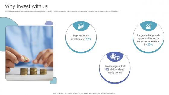 This slide represents multiple reasons for investing in our company. It includes reasons such as return on investment, dividends, and market growth opportunities.The best PPT templates are a great way to save time, energy, and resources. Slidegeeks have 100 percent editable powerpoint slides making them incredibly versatile. With these quality presentation templates, you can create a captivating and memorable presentation by combining visually appealing slides and effectively communicating your message. Download Why Invest With Us Investor Funding Pitch Deck For Automated Ar Platform from Slidegeeks and deliver a wonderful presentation. This slide represents multiple reasons for investing in our company. It includes reasons such as return on investment, dividends, and market growth opportunities.