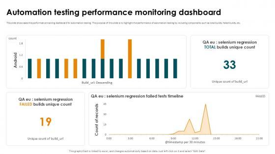 This slide showcases the performance tracking dashboard for automation testing. The purpose of this slide is to highlight the performance of automation testing by including components such as total builds, failed builds, etc. Get a simple yet stunning designed Automation Testing Performance Monitoring Smoke Testing Ppt Presentation. It is the best one to establish the tone in your meetings. It is an excellent way to make your presentations highly effective. So, download this PPT today from Slidegeeks and see the positive impacts. Our easy-to-edit Automation Testing Performance Monitoring Smoke Testing Ppt Presentation can be your go-to option for all upcoming conferences and meetings. So, what are you waiting for Grab this template today. This slide showcases the performance tracking dashboard for automation testing. The purpose of this slide is to highlight the performance of automation testing by including components such as total builds, failed builds, etc.