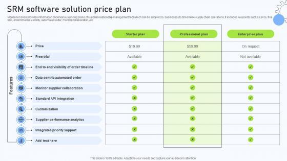 Mentioned slide provides information about various pricing plans of supplier relationship management tool which can be adopted by businesses to streamline supply chain operations. It includes key points such as price, free trial, order timeline visibility, automated order, monitor collaboration, etc. Present like a pro with Relationship Management Automation SRM Software Solution Price Plan. Create beautiful presentations together with your team, using our easy-to-use presentation slides. Share your ideas in real-time and make changes on the fly by downloading our templates. So whether you are in the office, on the go, or in a remote location, you can stay in sync with your team and present your ideas with confidence. With Slidegeeks presentation got a whole lot easier. Grab these presentations today. Mentioned slide provides information about various pricing plans of supplier relationship management tool which can be adopted by businesses to streamline supply chain operations. It includes key points such as price, free trial, order timeline visibility, automated order, monitor collaboration, etc.