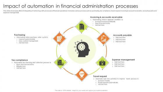 This slide showcases affect of integrating AI technology with processes of financial operations. It includes various process such as purchasing, tax compliance, travel request, invoicing and account receivable, account payable and expense management. Showcasing this set of slides titled Impact Of Automation In Financial Administration Processes Introduction Pdf. The topics addressed in these templates are Accounts Payable, Expense Management, Travel Request. All the content presented in this PPT design is completely editable. Download it and make adjustments in color, background, font etc. as per your unique business setting. This slide showcases affect of integrating AI technology with processes of financial operations. It includes various process such as purchasing, tax compliance, travel request, invoicing and account receivable, account payable and expense management.