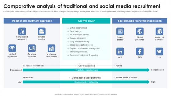 Following slide showcases approach to compare traditional and social media strategy for company hiring. It include growth drivers such as better opportunities, cost savings, service integration, standard procedures etc. Boost your pitch with our creative Comparative Analysis Of Traditional And Social Media Integrating Automation For Effective Business. Deliver an awe-inspiring pitch that will mesmerize everyone. Using these presentation templates you will surely catch everyones attention. You can browse the ppts collection on our website. We have researchers who are experts at creating the right content for the templates. So you do not have to invest time in any additional work. Just grab the template now and use them. Following slide showcases approach to compare traditional and social media strategy for company hiring. It include growth drivers such as better opportunities, cost savings, service integration, standard procedures etc.
