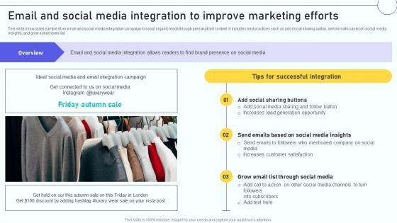 This slide showcases sample of an email and social media integration campaign to boost organic leads through personalized content. It includes best practices such as add social sharing button, send emails based on social media insights, and grow subscribers list. Whether you have daily or monthly meetings, a brilliant presentation is necessary. Email Marketing Automation Process Email And Social Media Integration To Improve can be your best option for delivering a presentation. Represent everything in detail using Email Marketing Automation Process Email And Social Media Integration To Improve and make yourself stand out in meetings. The template is versatile and follows a structure that will cater to your requirements. All the templates prepared by Slidegeeks are easy to download and edit. Our research experts have taken care of the corporate themes as well. So, give it a try and see the results. This slide showcases sample of an email and social media integration campaign to boost organic leads through personalized content. It includes best practices such as add social sharing button, send emails based on social media insights, and grow subscribers list.