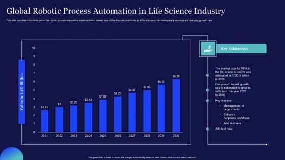 This slide provides information about the robotic process automation implementation market size of the life science industry in different years. It includes yearly earnings and changing growth rate. Pitch your topic with ease and precision using this Global Robotic Process Automation In Life Science Industry Icons Pdf. This layout presents information on Global Robotic Process Automation In Life Science Industry. It is also available for immediate download and adjustment. So, changes can be made in the color, design, graphics or any other component to create a unique layout. This slide provides information about the robotic process automation implementation market size of the life science industry in different years. It includes yearly earnings and changing growth rate.