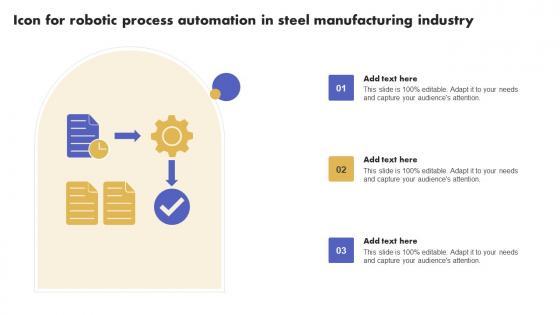 Showcasing this set of slides titled Icon For Robotic Process Automation In Steel Manufacturing Industry Sample Pdf The topics addressed in these templates are Icon Robotic, Process Automation, Steel Manufacturing Industry All the content presented in this PPT design is completely editable. Download it and make adjustments in color, background, font etc. as per your unique business setting. Our Icon For Robotic Process Automation In Steel Manufacturing Industry Sample Pdf are topically designed to provide an attractive backdrop to any subject. Use them to look like a presentation pro.