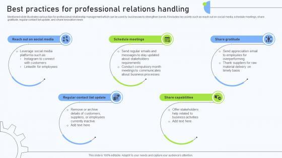 Mentioned slide illustrates various tips for professional relationship management which can be used by businesses to strengthen bonds. It includes key points such as reach out on social media, schedule meetings, share gratitude, regular contact list update, and share innovation news. Do you have to make sure that everyone on your team knows about any specific topic I yes, then you should give Relationship Management Automation Best Practices For Professional Relations Handling a try. Our experts have put a lot of knowledge and effort into creating this impeccable Relationship Management Automation Best Practices For Professional Relations Handling. You can use this template for your upcoming presentations, as the slides are perfect to represent even the tiniest detail. You can download these templates from the Slidegeeks website and these are easy to edit. So grab these today Mentioned slide illustrates various tips for professional relationship management which can be used by businesses to strengthen bonds. It includes key points such as reach out on social media, schedule meetings, share gratitude, regular contact list update, and share innovation news.