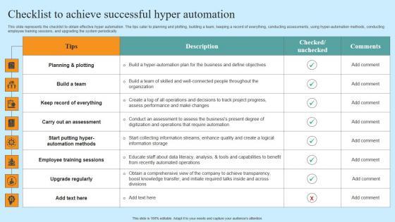 This slide represents the checklist to obtain effective hyper automation. The tips cater to planning and plotting, building a team, keeping a record of everything, conducting assessments, using hyper-automation methods, conducting employee training sessions, and upgrading the system periodically. Slidegeeks is here to make your presentations a breeze with Checklist To Achieve Successful Hyper Automation Hyper Automation Solutions Professional Pdf With our easy-to-use and customizable templates, you can focus on delivering your ideas rather than worrying about formatting. With a variety of designs to choose from, you are sure to find one that suits your needs. And with animations and unique photos, illustrations, and fonts, you can make your presentation pop. So whether you are giving a sales pitch or presenting to the board, make sure to check out Slidegeeks first This slide represents the checklist to obtain effective hyper automation. The tips cater to planning and plotting, building a team, keeping a record of everything, conducting assessments, using hyper-automation methods, conducting employee training sessions, and upgrading the system periodically.