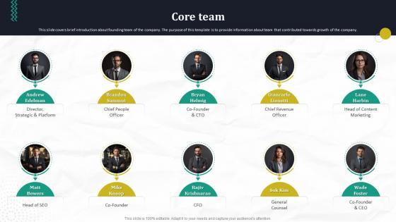 This slide covers brief introduction about founding team of the company. The purpose of this template is to provide information about team that contributed towards growth of the company. There are so many reasons you need a Core Team Task Automation Company Investor Funding Elevator Pitch Deck. The first reason is you can not spend time making everything from scratch, Thus, Slidegeeks has made presentation templates for you too. You can easily download these templates from our website easily. This slide covers brief introduction about founding team of the company. The purpose of this template is to provide information about team that contributed towards growth of the company.