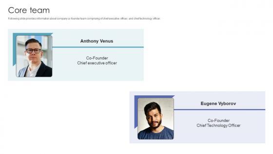 Following slide provides information about company co founder team comprising of chief executive officer, and chief technology officer.Do you have to make sure that everyone on your team knows about any specific topic I yes, then you should give Core Team Investor Funding Pitch Deck For Automated Ar Platform a try. Our experts have put a lot of knowledge and effort into creating this impeccable Core Team Investor Funding Pitch Deck For Automated Ar Platform. You can use this template for your upcoming presentations, as the slides are perfect to represent even the tiniest detail. You can download these templates from the Slidegeeks website and these are easy to edit. So grab these today Following slide provides information about company co founder team comprising of chief executive officer, and chief technology officer.