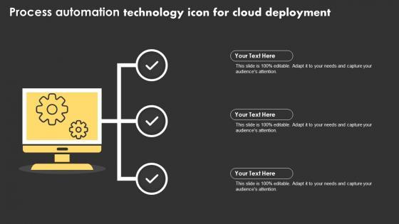 Showcasing this set of slides titled Process Automation Technology Icon For Cloud Deployment Ideas Pdf. The topics addressed in these templates are Process Automation Technology, Cloud Deployment. All the content presented in this PPT design is completely editable. Download it and make adjustments in color, background, font etc. as per your unique business setting. Our Process Automation Technology Icon For Cloud Deployment Ideas Pdf are topically designed to provide an attractive backdrop to any subject. Use them to look like a presentation pro.