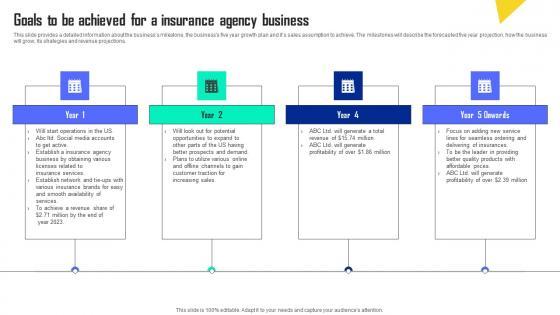 This slide provides a detailed information about the businesss milestone, the businesss five year growth plan and its sales assumption to achieve. The milestones will describe the forecasted five year projection, how the business will grow, its strategies and revenue projections. Find highly impressive Goals To Be Achieved For A Insurance Agency Business Automobile Insurance Agency Inspiration Pdf on Slidegeeks to deliver a meaningful presentation. You can save an ample amount of time using these presentation templates. No need to worry to prepare everything from scratch because Slidegeeks experts have already done a huge research and work for you. You need to download Goals To Be Achieved For A Insurance Agency Business Automobile Insurance Agency Inspiration Pdf for your upcoming presentation. All the presentation templates are 100 percent editable and you can change the color and personalize the content accordingly. Download now. This slide provides a detailed information about the businesss milestone, the businesss five year growth plan and its sales assumption to achieve. The milestones will describe the forecasted five year projection, how the business will grow, its strategies and revenue projections.