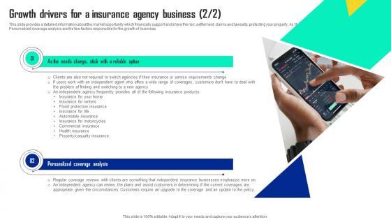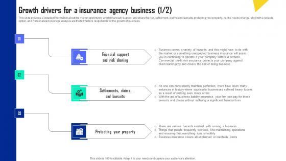 This slide provides a detailed information about the market opportunity which financially support and share the risk, settlement, claims and lawsuits, protecting your property, As the needs change, stick with a reliable option, and Personalized coverage analysis are the few factors responsible for the growth of business. If your project calls for a presentation, then Slidegeeks is your go-to partner because we have professionally designed, easy-to-edit templates that are perfect for any presentation. After downloading, you can easily edit Growth Drivers For A Insurance Agency Business 1 2 Automobile Insurance Agency Designs Pdf and make the changes accordingly. You can rearrange slides or fill them with different images. Check out all the handy templates This slide provides a detailed information about the market opportunity which financially support and share the risk, settlement, claims and lawsuits, protecting your property, As the needs change, stick with a reliable option, and Personalized coverage analysis are the few factors responsible for the growth of business.