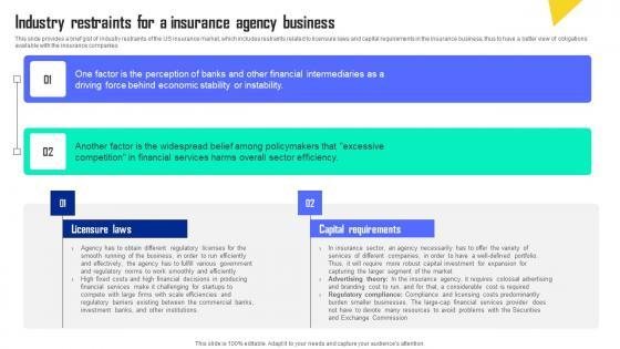 This slide provides a brief gist of industry restraints of the US insurance market, which includes restraints related to licensure laws and capital requirements in the insurance business, thus to have a better view of obligations available with the insurance companies. Are you in need of a template that can accommodate all of your creative concepts This one is crafted professionally and can be altered to fit any style. Use it with Google Slides or PowerPoint. Include striking photographs, symbols, depictions, and other visuals. Fill, move around, or remove text boxes as desired. Test out color palettes and font mixtures. Edit and save your work, or work with colleagues. Download Industry Restraints For A Insurance Agency Business Automobile Insurance Agency Inspiration Pdf and observe how to make your presentation outstanding. Give an impeccable presentation to your group and make your presentation unforgettable. This slide provides a brief gist of industry restraints of the US insurance market, which includes restraints related to licensure laws and capital requirements in the insurance business, thus to have a better view of obligations available with the insurance companies.