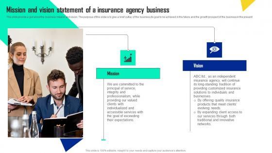 This slide provide a gist about the business mission and vision. The purpose of this slide is to give a brief outlay of the business its goal to be achieved in the future and the growth prospect of the business in the present. Explore a selection of the finest Mission And Vision Statement Of A Insurance Agency Business Automobile Insurance Agency Sample Pdf here. With a plethora of professionally designed and pre-made slide templates, you can quickly and easily find the right one for your upcoming presentation. You can use our Mission And Vision Statement Of A Insurance Agency Business Automobile Insurance Agency Sample Pdf to effectively convey your message to a wider audience. Slidegeeks has done a lot of research before preparing these presentation templates. The content can be personalized and the slides are highly editable. Grab templates today from Slidegeeks. This slide provide a gist about the business mission and vision. The purpose of this slide is to give a brief outlay of the business its goal to be achieved in the future and the growth prospect of the business in the present.