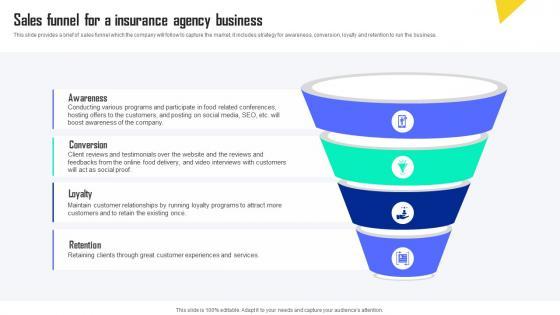 This slide provides a brief of sales funnel which the company will follow to capture the market, it includes strategy for awareness, conversion, loyalty and retention to run the business. Here you can discover an assortment of the finest PowerPoint and Google Slides templates. With these templates, you can create presentations for a variety of purposes while simultaneously providing your audience with an eye-catching visual experience. Download Sales Funnel For A Insurance Agency Business Automobile Insurance Agency Topics Pdf to deliver an impeccable presentation. These templates will make your job of preparing presentations much quicker, yet still, maintain a high level of quality. Slidegeeks has experienced researchers who prepare these templates and write high-quality content for you. Later on, you can personalize the content by editing the Sales Funnel For A Insurance Agency Business Automobile Insurance Agency Topics Pdf. This slide provides a brief of sales funnel which the company will follow to capture the market, it includes strategy for awareness, conversion, loyalty and retention to run the business.