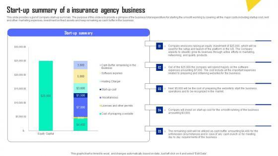 This slide provides a gist of company start-up summary. The purpose of this slide is to provide a glimpse of the business total expenditure for starting the smooth working by covering all the major costs including startup cost, rent and other marketing expenses, investment on fixed assets and keep remaining as cash buffer in the business. Do you know about Slidesgeeks Start Up Summary Of A Insurance Agency Business Automobile Insurance Agency Infographics Pdf These are perfect for delivering any kind od presentation. Using it, create PowerPoint presentations that communicate your ideas and engage audiences. Save time and effort by using our pre-designed presentation templates that are perfect for a wide range of topic. Our vast selection of designs covers a range of styles, from creative to business, and are all highly customizable and easy to edit. Download as a PowerPoint template or use them as Google Slides themes. This slide provides a gist of company start-up summary. The purpose of this slide is to provide a glimpse of the business total expenditure for starting the smooth working by covering all the major costs including startup cost, rent and other marketing expenses, investment on fixed assets and keep remaining as cash buffer in the business.