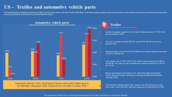 This slide highlights the detailed assessment of textiles and automotive vehicle parts export in the United States. It will help in getting valuable insights and project the success that the export business expects while introducing its brand and its products and services to consumers within the market. Slidegeeks is here to make your presentations a breeze with Us Textiles And Automotive Vehicle Parts Export Business Plan Sample Pdf With our easy-to-use and customizable templates, you can focus on delivering your ideas rather than worrying about formatting. With a variety of designs to choose from, you are sure to find one that suits your needs. And with animations and unique photos, illustrations, and fonts, you can make your presentation pop. So whether you are giving a sales pitch or presenting to the board, make sure to check out Slidegeeks first. This slide highlights the detailed assessment of textiles and automotive vehicle parts export in the United States. It will help in getting valuable insights and project the success that the export business expects while introducing its brand and its products and services to consumers within the market.