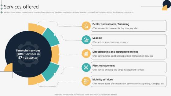 Mentioned slide outlines various financial services offered by company. It includes services such as dealer financing, customer financing, vehicle leasing, direct banking, insurance, etc.Find a pre-designed and impeccable Services Offered Automotive Manufacturing Company Profile CP SS V. The templates can ace your presentation without additional effort. You can download these easy-to-edit presentation templates to make your presentation stand out from others. So, what are you waiting for Download the template from Slidegeeks today and give a unique touch to your presentation. Mentioned slide outlines various financial services offered by company. It includes services such as dealer financing, customer financing, vehicle leasing, direct banking, insurance, etc.