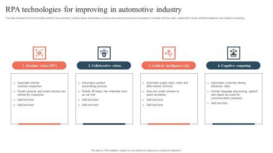 This slide includes the top technologies utilized in the automotive industry aimed at automating customer documents and payment processing. It includes machine vision, collaborative robots, artificial intelligence, and cognitive computing. Pitch your topic with ease and precision using this RPA Technologies For Improving In Automotive Industry Designs Pdf. This layout presents information on Machine Vision, Collaborative Robots, Artificial Intelligence. It is also available for immediate download and adjustment. So, changes can be made in the color, design, graphics or any other component to create a unique layout. This slide includes the top technologies utilized in the automotive industry aimed at automating customer documents and payment processing. It includes machine vision, collaborative robots, artificial intelligence, and cognitive computing.