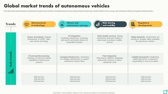 This slide showcases the global market trends of autonomous vehicles. It includes trends such as advancements in technology, electric and autonomous synergy, ride-sharing and mobility and regulatory developments. Make sure to capture your audiences attention in your business displays with our gratis customizable Global Market Trends Of Autonomous Vehicles Innovative Tactics For Revving Up Strategy SS. These are great for business strategies, office conferences, capital raising or task suggestions. If you desire to acquire more customers for your tech business and ensure they stay satisfied, create your own sales presentation with these plain slides. This slide showcases the global market trends of autonomous vehicles. It includes trends such as advancements in technology, electric and autonomous synergy, ride-sharing and mobility and regulatory developments.s