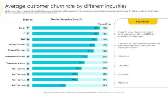 Mentioned slide outlines a graphical representation of the average attrition rate in multiple industries. The major industries covered in the slide are energy, information technology IT, Software as a Service SaaS, industry services, financial services, professional services, and telecommunications. Presenting this PowerPoint presentation, titled Average Customer Churn Rate By Different Industries Diagrams PDF, with topics curated by our researchers after extensive research. This editable presentation is available for immediate download and provides attractive features when used. Download now and captivate your audience. Presenting this Average Customer Churn Rate By Different Industries Diagrams PDF. Our researchers have carefully researched and created these slides with all aspects taken into consideration. This is a completely customizable Average Customer Churn Rate By Different Industries Diagrams PDF that is available for immediate downloading. Download now and make an impact on your audience. Highlight the attractive features available with our PPTs.