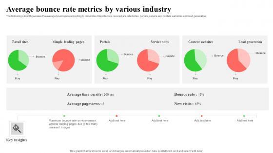 The Following slide showcases average bounce rate of industry, competitors and our company. Major reasons for high bounce rate are page loading, misleading title, technical errors and bad link. Pitch your topic with ease and precision using this Average Bounce Rate KPI Metrics By Various Industrys Inspiration Pdf. This layout presents information on Page Loading, Misleading Title, Technical Errors. It is also available for immediate download and adjustment. So, changes can be made in the color, design, graphics or any other component to create a unique layout. The Following slide showcases average bounce rate of industry, competitors and our company. Major reasons for high bounce rate are page loading, misleading title, technical errors and bad link.