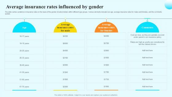 The slide carries variations in insurance rates on the basis of the gender of policyholders within different age groups. Various elements included are age, average insurance rates for males and females, and the comments section. From laying roadmaps to briefing everything in detail, our templates are perfect for you. You can set the stage with your presentation slides. All you have to do is download these easy-to-edit and customizable templates. Average Insurance Rates Influenced Steps By Step Guide For Claiming Car PPT Slide will help you deliver an outstanding performance that everyone would remember and praise you for. Do download this presentation today. The slide carries variations in insurance rates on the basis of the gender of policyholders within different age groups. Various elements included are age, average insurance rates for males and females, and the comments section.
