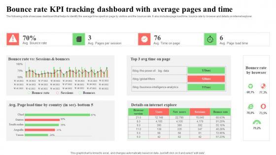 The following slide showcases dashboard that helps to identify the average time spent on page by visitors and the bounce rate. It also includes page load time, bounce rate by browser and details on internet explorer. Pitch your topic with ease and precision using this Bounce Rate KPI Tracking Dashboard With Average Pages And Time Inspiration Pdf. This layout presents information on Page Load Time, Bounce Rate, Internet Explorer. It is also available for immediate download and adjustment. So, changes can be made in the color, design, graphics or any other component to create a unique layout. The following slide showcases dashboard that helps to identify the average time spent on page by visitors and the bounce rate. It also includes page load time, bounce rate by browser and details on internet explorer.