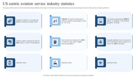 The purpose of this slide is to showcase airline industry statistics of US region. It includes various data pertaining to increase in passengers, revenue in 2022, carbon emissions, jet fuel etc. Pitch your topic with ease and precision using this Us Centric Aviation Service Industry Statistics Diagrams Pdf. This layout presents information on Carbon Emissions, Airline Passengers. It is also available for immediate download and adjustment. So, changes can be made in the color, design, graphics or any other component to create a unique layout. The purpose of this slide is to showcase airline industry statistics of US region. It includes various data pertaining to increase in passengers, revenue in 2022, carbon emissions, jet fuel etc.