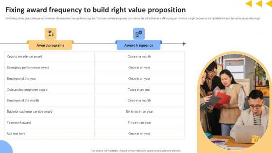 Following slides gives a frequency overview of reward and recognition program. Too many award programs can reduce the attractiveness of the program. Hence, a right frequency is important to keep the value proposition high. Retrieve professionally designed Improving HRM Process Fixing Award Frequency To Build Right Value Proposition Information PDF to effectively convey your message and captivate your listeners. Save time by selecting pre-made slideshows that are appropriate for various topics, from business to educational purposes. These themes come in many different styles, from creative to corporate, and all of them are easily adjustable and can be edited quickly. Access them as PowerPoint templates or as Google Slides themes. You dont have to go on a hunt for the perfect presentation because Slidegeeks got you covered from everywhere.