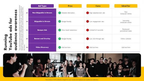 This slide showcases YouTube ads that can help restaurant to promote food and services in video format. Different types of ads are - non skippable in stream, skippable in stream, bumper ads, banner and overlay plus video discovery. Boost your pitch with our creative Strategic Promotional Guide For Restaurant Business Advertising Running Youtube Ads For Audience Awareness Slides PDF. Deliver an awe-inspiring pitch that will mesmerize everyone. Using these presentation templates you will surely catch everyones attention. You can browse the ppts collection on our website. We have researchers who are experts at creating the right content for the templates. So you don not have to invest time in any additional work. Just grab the template now and use them.
