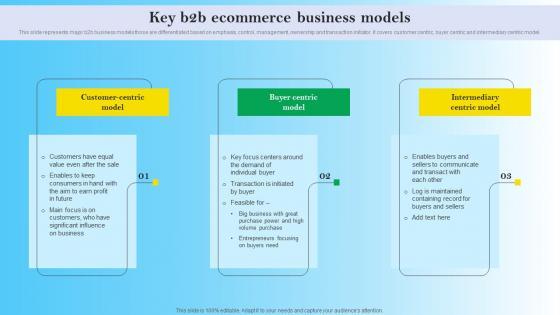 This slide represents major b2b business models those are differentiated based on emphasis, control, management, ownership and transaction initiator. It covers customer centric, buyer centric and intermediary centric model.This modern and well-arranged Key B2b Ecommerce Business Models Comprehensive Guide For Developing Designs PDF provides lots of creative possibilities. It is very simple to customize and edit with the Powerpoint Software. Just drag and drop your pictures into the shapes. All facets of this template can be edited with Powerpoint no extra software is necessary. Add your own material, put your images in the places assigned for them, adjust the colors, and then you can show your slides to the world, with an animated slide included.